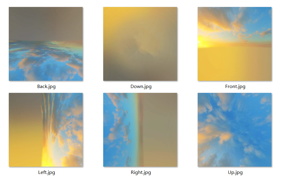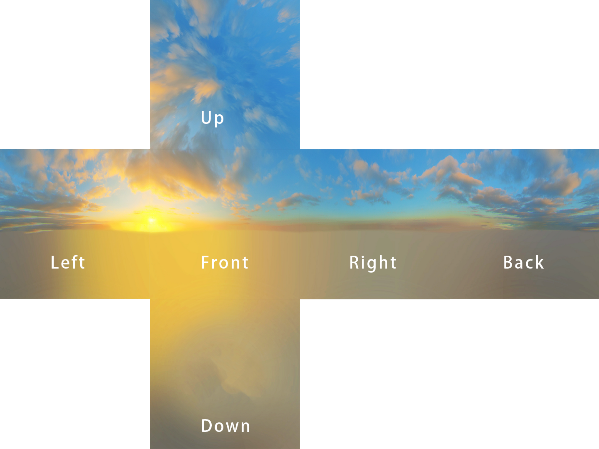sources: { positiveX : './images/天空盒素材/晴天/Right.jpg', negativeX : './images/天空盒素材/晴天/Left.jpg', positiveY : './images/天空盒素材/晴天/Front.jpg', negativeY : './images/天空盒素材/晴天/Back.jpg', positiveZ : './images/天空盒素材/晴天/Up.jpg', negativeZ : './images/天空盒素材/晴天/Down.jpg' }