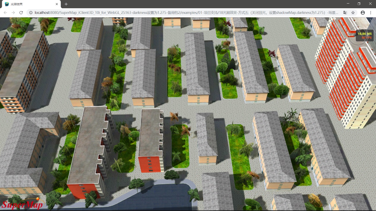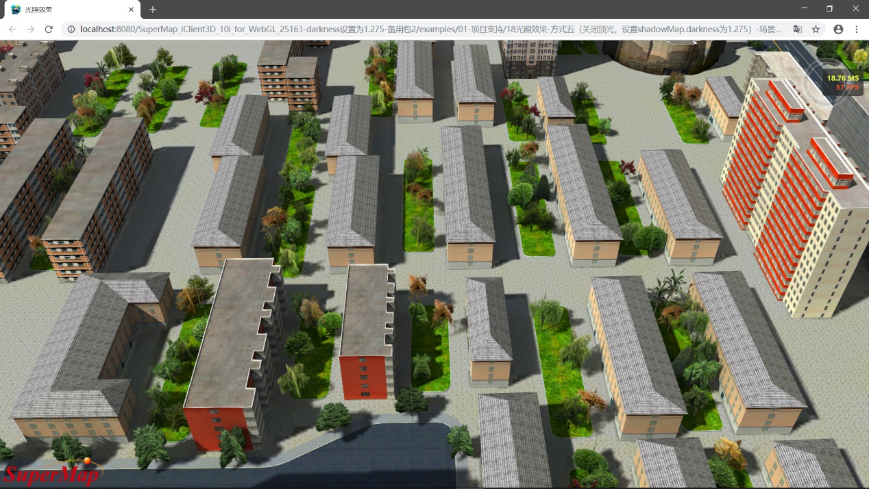 有时会碰到带有两重纹理的模型,其中一层是常见的决定模型外观的漫反射纹理,另外一层则是制造模型光影明暗的烘焙纹理(一般通过3ds Max里面的烘焙功能制作)。在SuperMap iClient3D for WebGL/WebGPU中,提供了一个默认的参数(scene.shadowMap.darkness)来决定二者的叠加效果,来满足大多数的需求,如果想要自定义二者的叠加效果,可以对该参数进行修改。