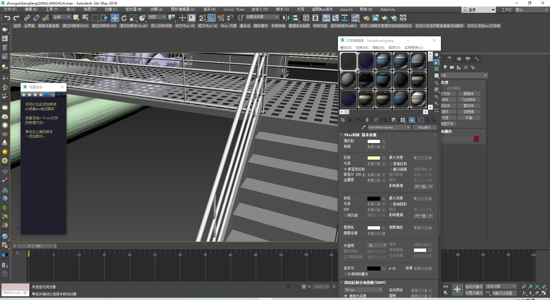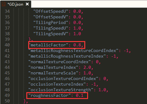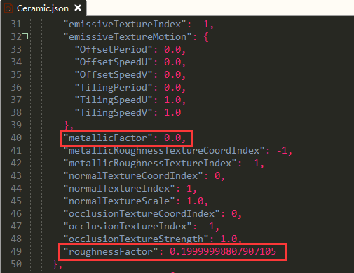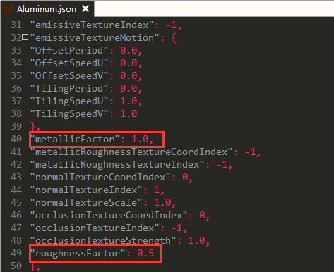 在3ds Max中,查看数据的材质参数,所有金属对象的粗糙度均为0,金属度均为0.8,因此在Json文件中,设置"roughnessFactor": 0.01,"metallicFactor":
